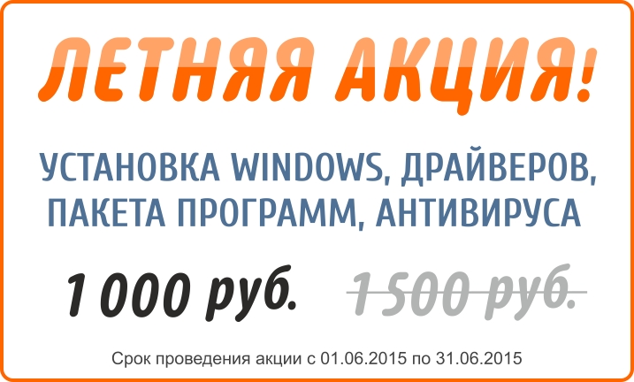 Летняя акция! Установка Windows, драйверов, пакета программ, антивируса всего за 1000 ք. Срок проведения акции с 01.06.2015 по 31.06.2015. Акция завершена.
